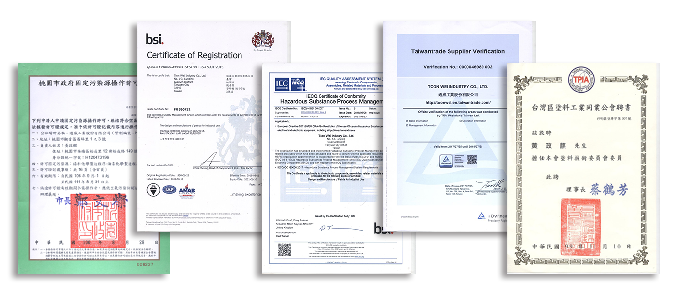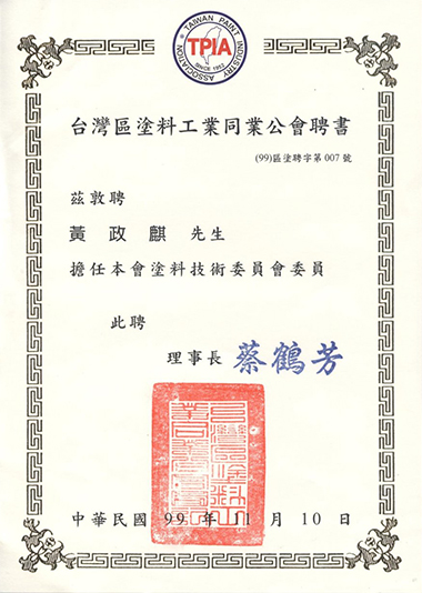 無毒企業、先進單位、偉訓最佳夥伴、外貿企業增資擴股大戶、榮譽認證、台灣區塗料公會技術委員