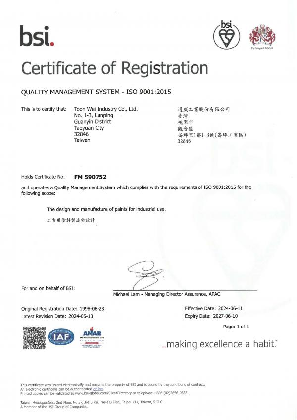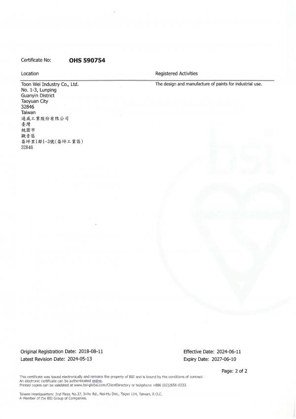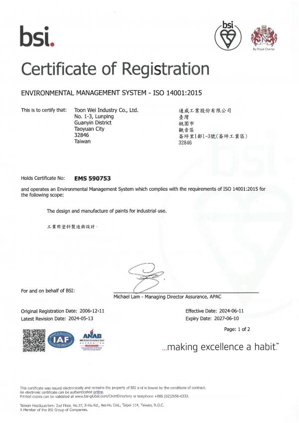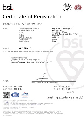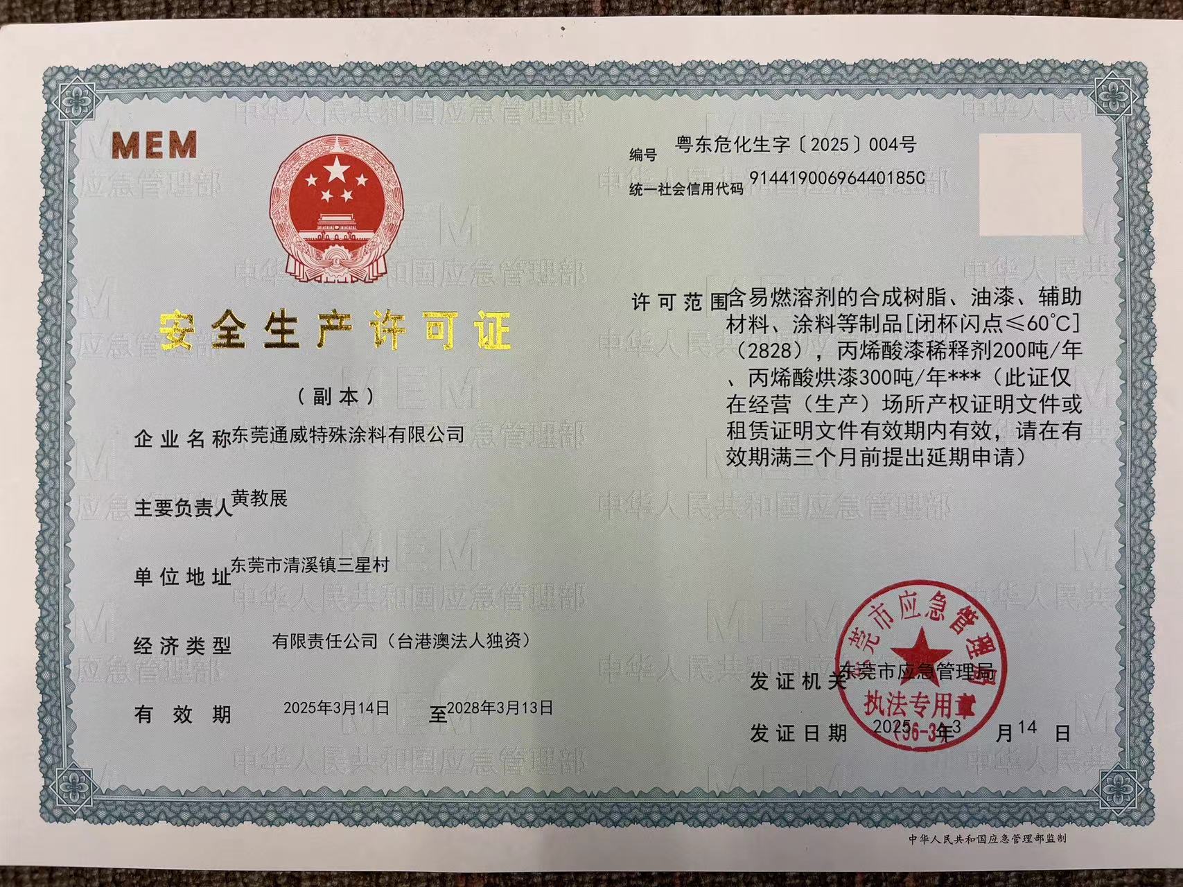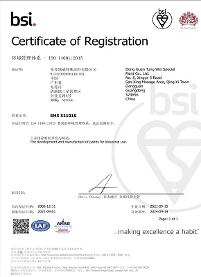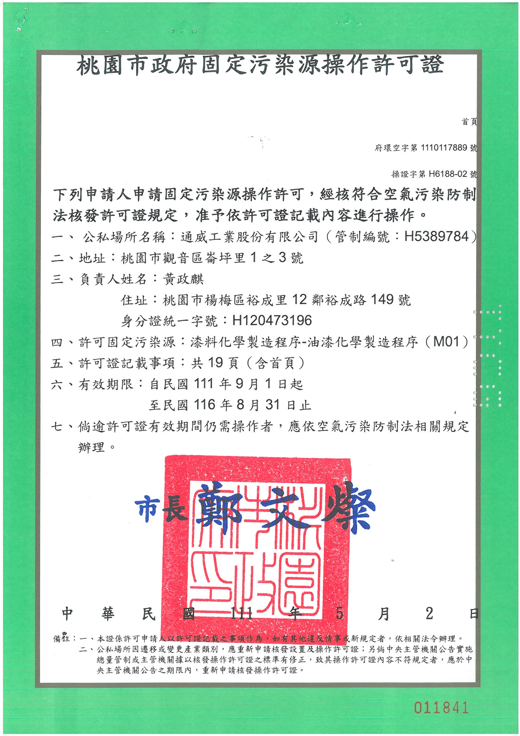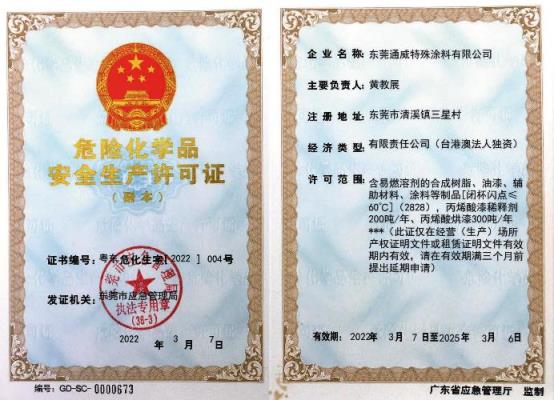 目前大陸廠擁有危險化學品安全生產許可證及符合相關政府環保規定,並通過BSI ISO 9001/14001/45001及QC080000等國際認證