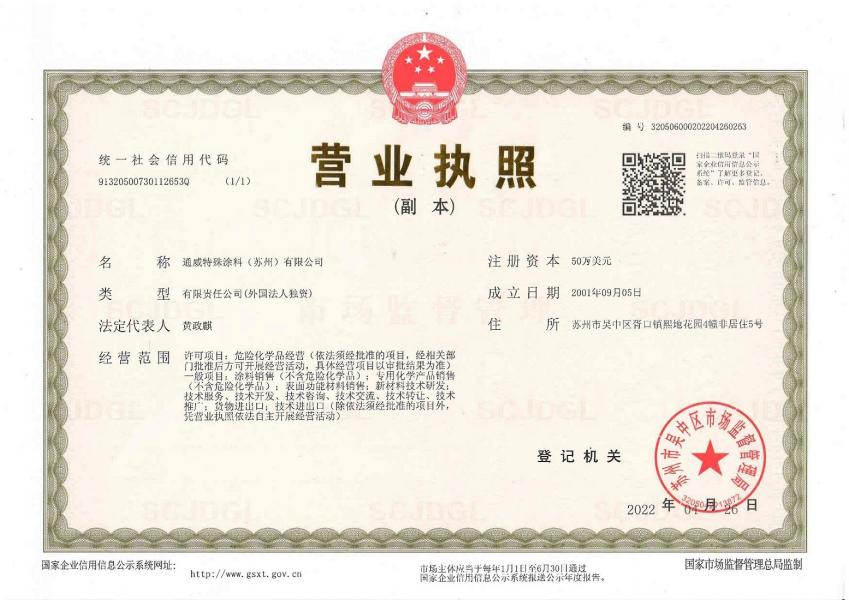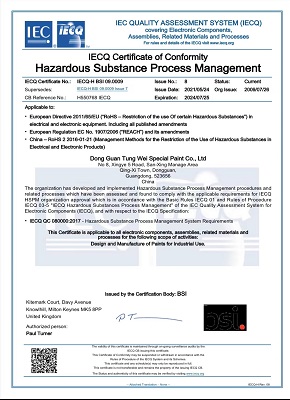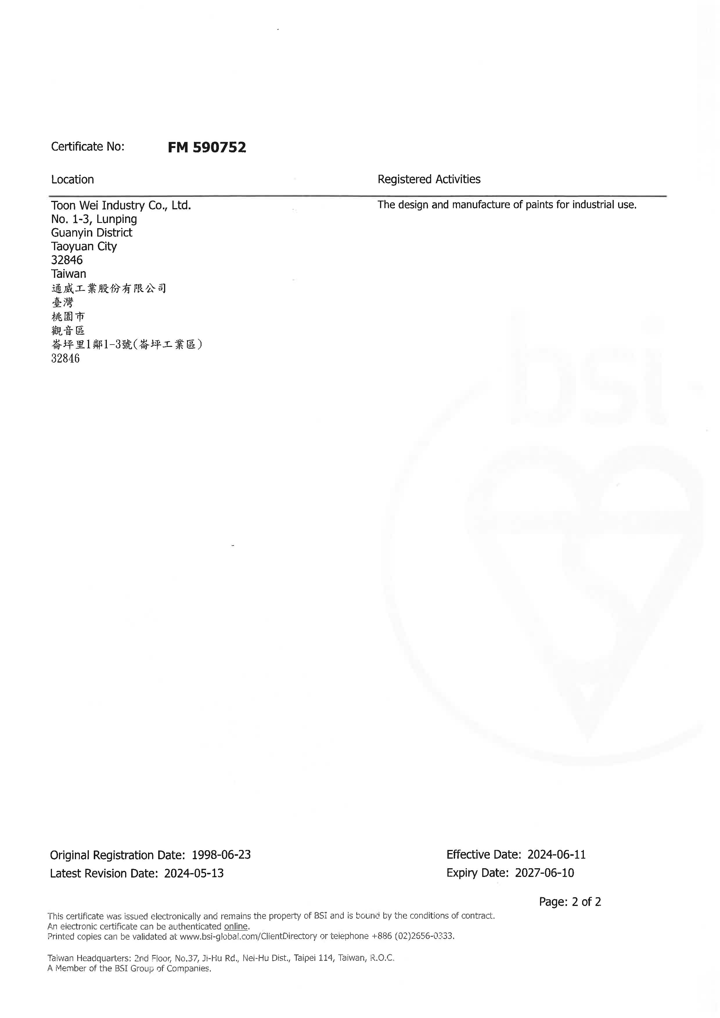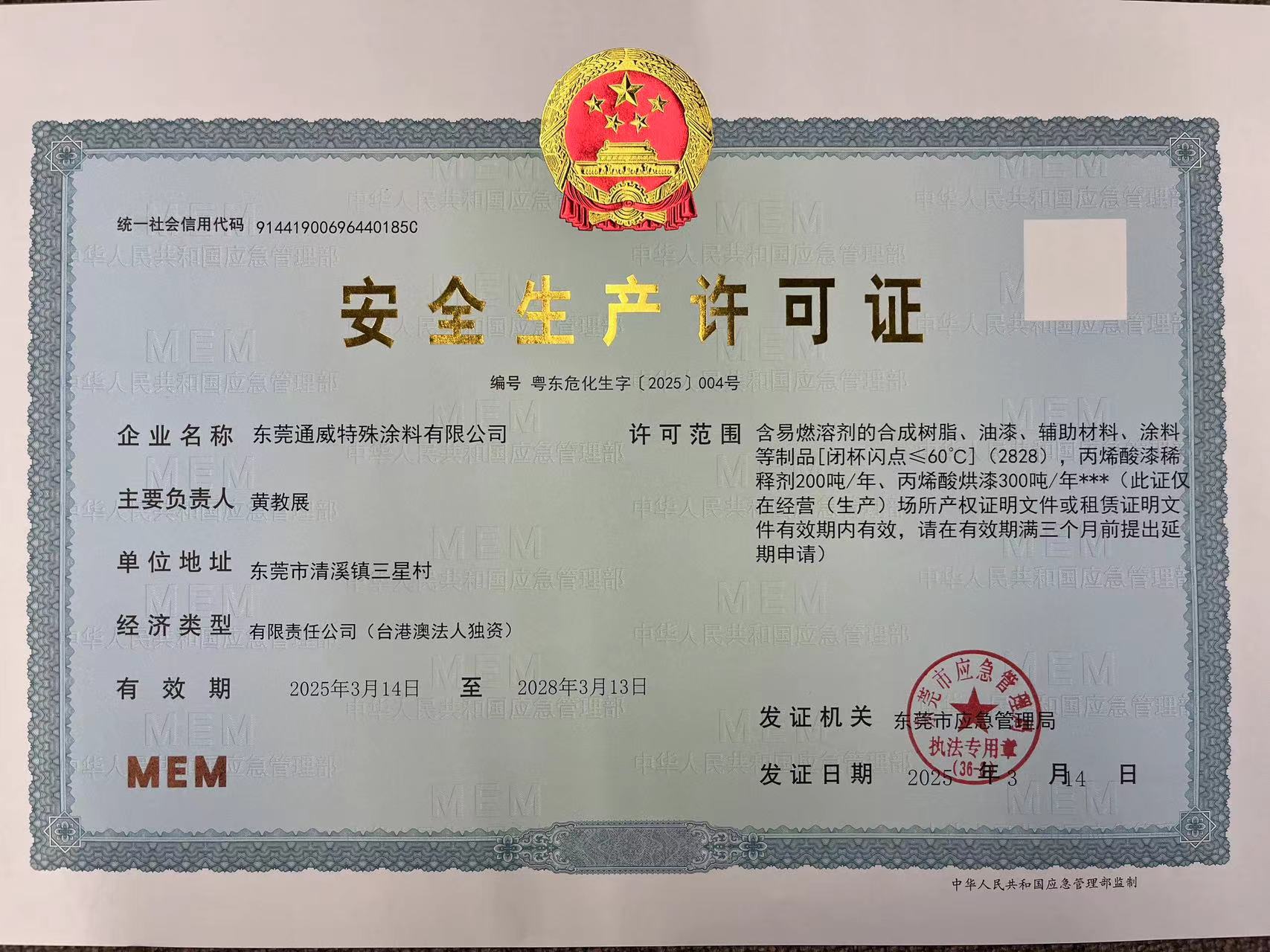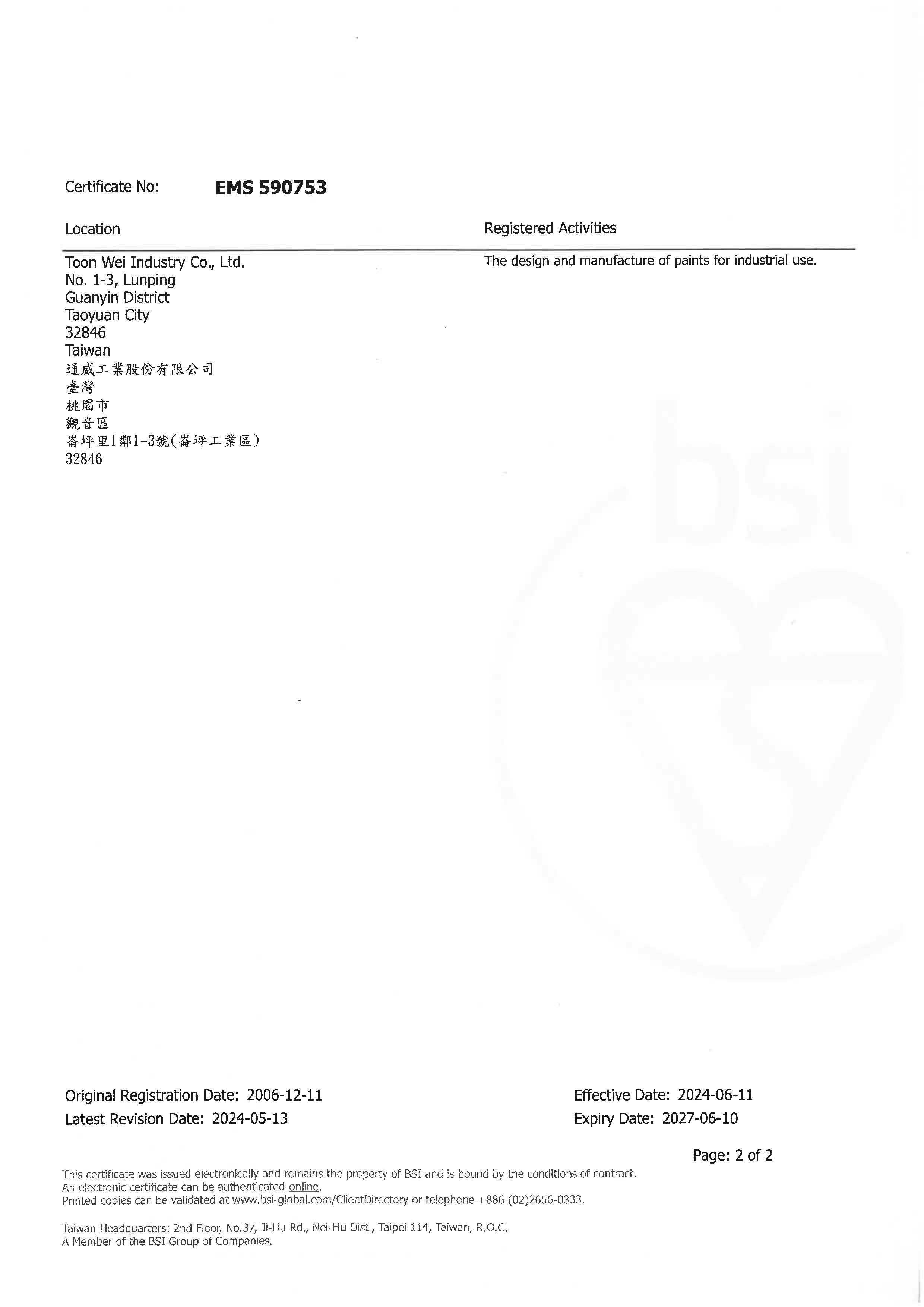 目前大陸廠擁有危險化學品安全生產許可證及符合相關政府環保規定,並通過BSI ISO 9001/14001/45001及QC080000等國際認證