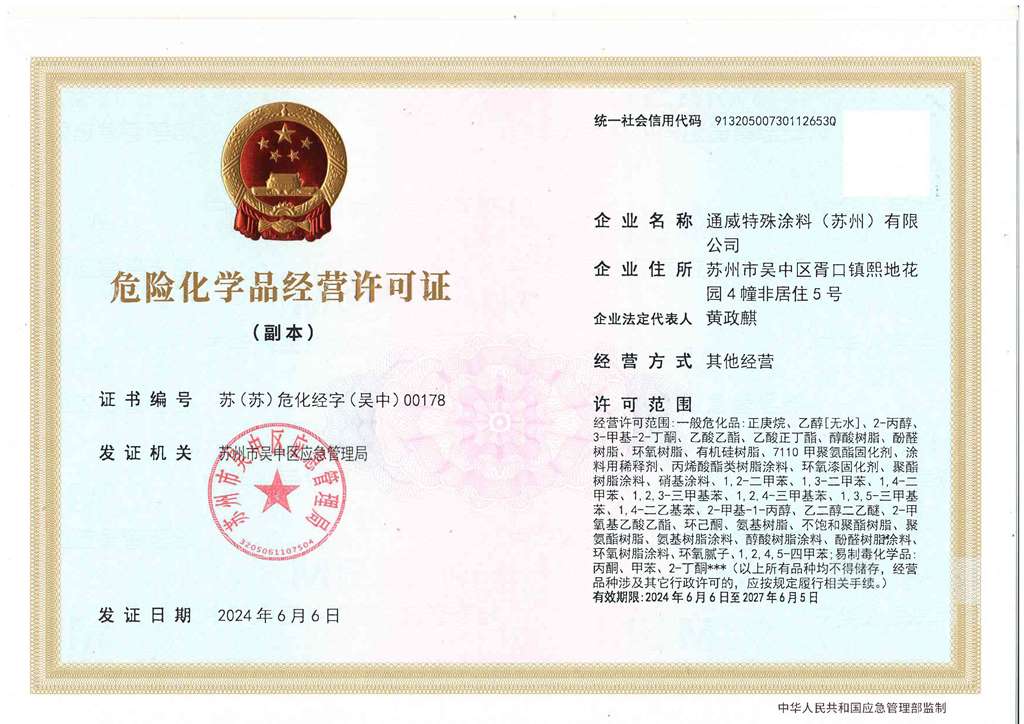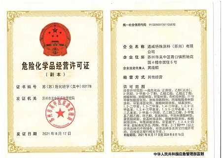 危險化學品安全生產及經營許可證(清溪、蘇州),固定汙染源操作許可證,清溪排汙許可證