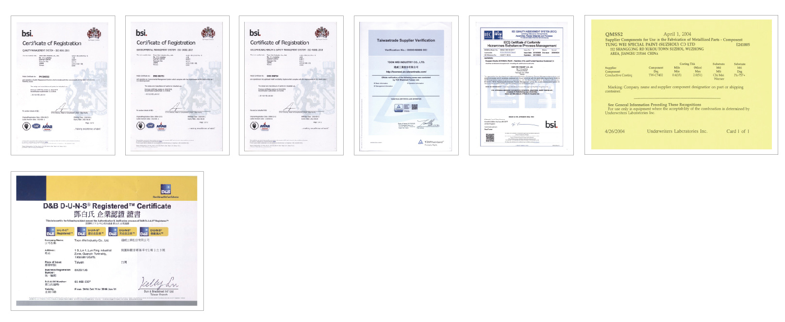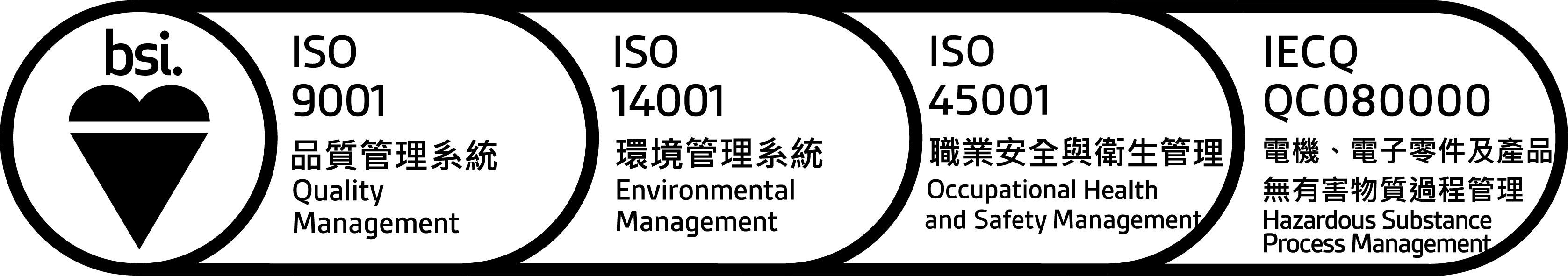 BSI ISO 9001/14001/45001及QC080000、鄧白氏企業認證、德國萊因企業營運能力認證、UL防電磁波認證
